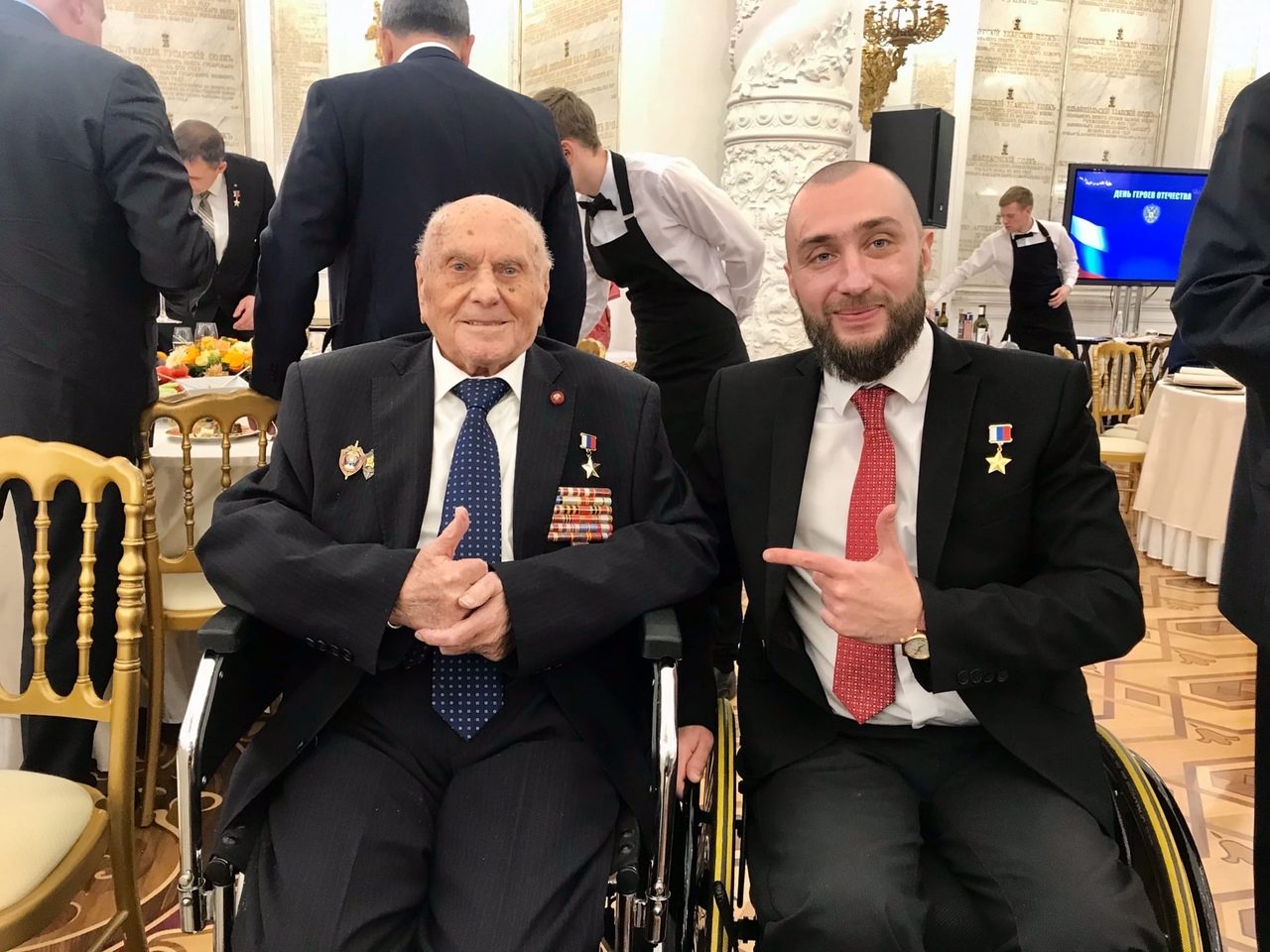 Герои Российской Федерации В. М. Воробьёв (справа) и А. Н. Ботян на приёме по случаю Дня Героев Отечества.