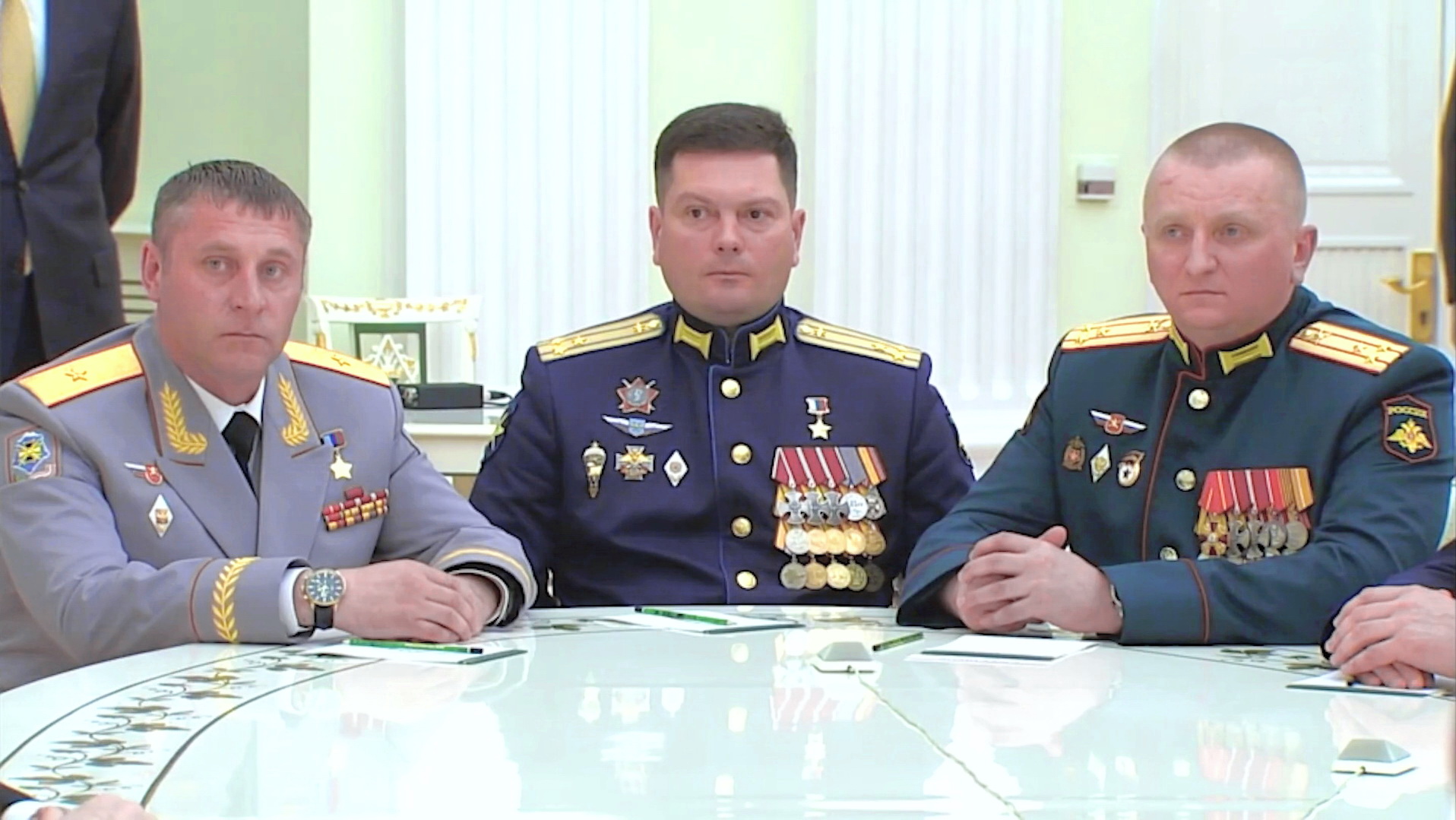 Слева направо: генерал-майор А. М. Шуваев, Герои Российской Федерации полковник Д. Ю. Чернавин и гвардии полковник Р. Р. Халиков на встрече президента России В. В. Путина с командирами соединений, участвующих в специальной военной операции. Москва, Кремль, 7 мая 2024 года. Фото: Администрация Президента России.