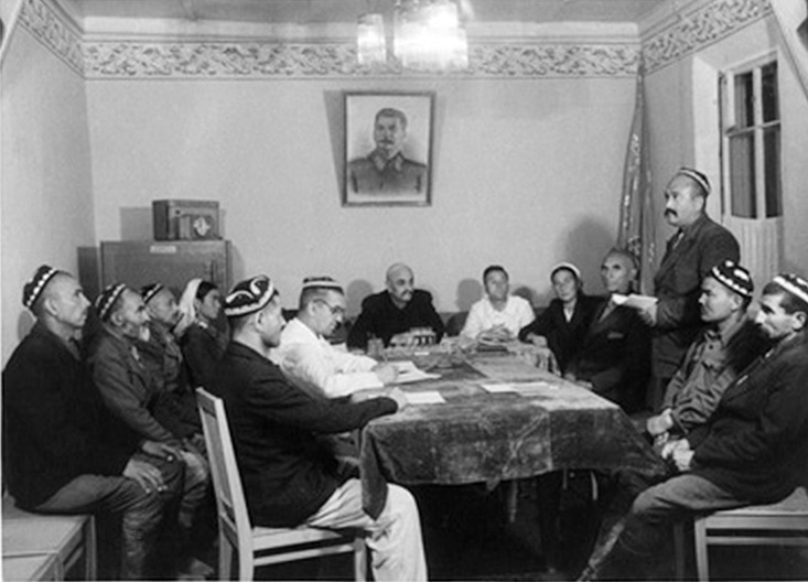 Заседание правления колхоза имени Кагановича Янги-Юльского района, на котором выступает председатель Совета урожайности колхоза Мирсулейман Якубов, во главе стола сидит председатель правления Хамракул Турсункулов. Фото из фондов Государственного центрального музея современной истории России.