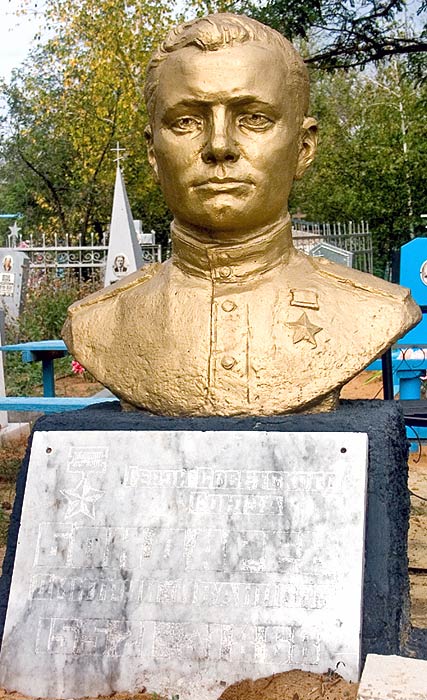 Бюст на могиле Героя. Установлен на кладбище города Богучар Воронежской области. Фото Николая Дядина (город Богучар). 2008 год.
