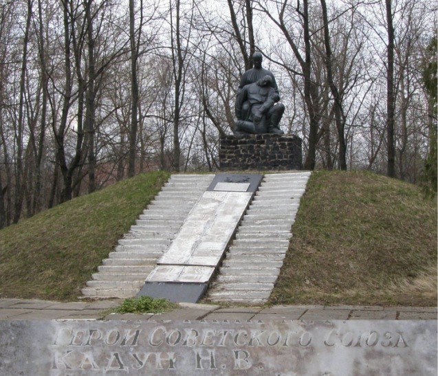 Памятный знак погибшим землякам, среди которых имя Н.В.Кадуна. Установлен в городе Батурин Бахмачского района Черниговской области (Украина) на улице Гетманской. Скульпторы Г.Хусид, А.И.Коломиец. Открыт в 1975 году. Фото Олега Кожухаря, 10.04.2010.