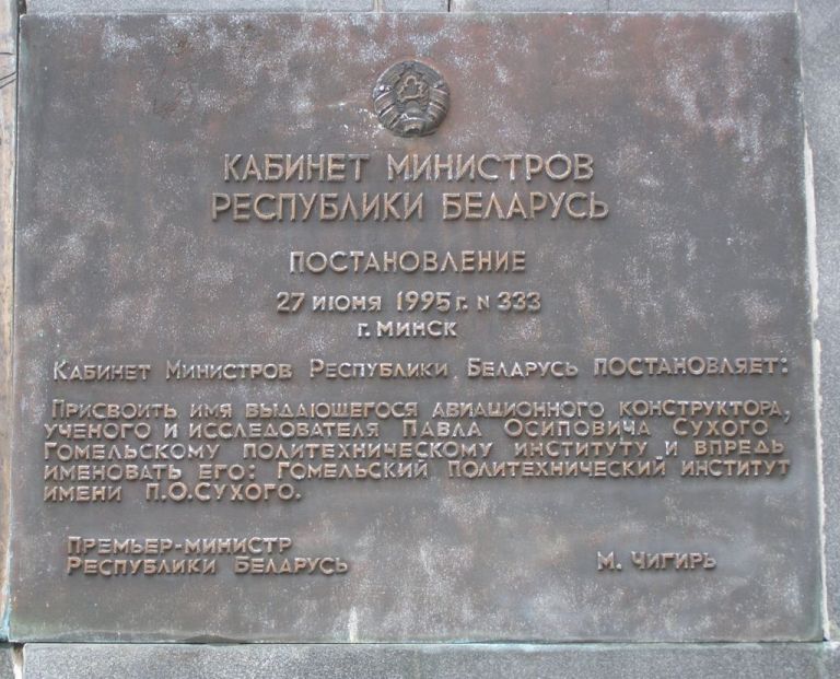 Фрагмент памятного знака, установленного в городе Гомель (Белоруссия) перед зданием Гомельского государственного технического университета имени П.О.Сухого (проспект Октября, 48). Фото Олега Кожухаря, 3.05.2011.