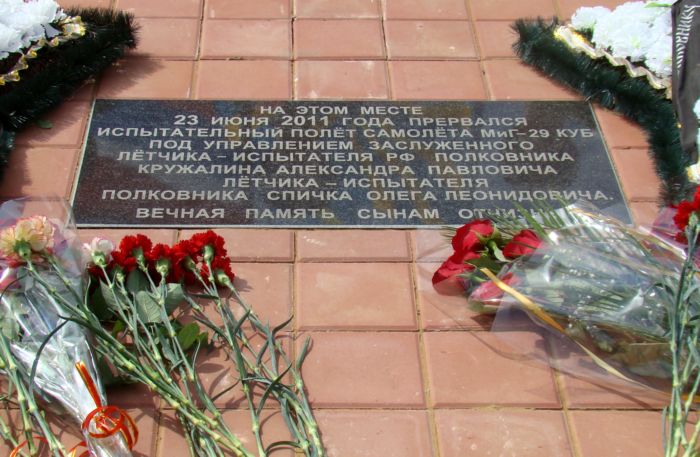 Памятный знак на месте гибели А.П.Кружалина и О.Л.Спички в 43 км от Ахтубинска, в районе между горой Багдо и селом Болхуны. Открыт в июле 2011 года.