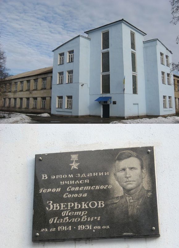 Установлена на здании школы № 141, в которой учился П.П.Зверьков (улица Верейского, 14) в городе Донецк (Украина). Фото Олега и Елены Кныш.