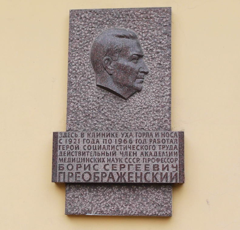Установлена в Москве (Ленинский проспект, дом 8, корпус 12) на здании, в котором в 1921-1966 годах работал Б.С.Преображенский. Автор доски Н.Н.Миловидов. Открыта 30 ноября 1976 года. Фото Станислава Лебедева, 28.05.2012.