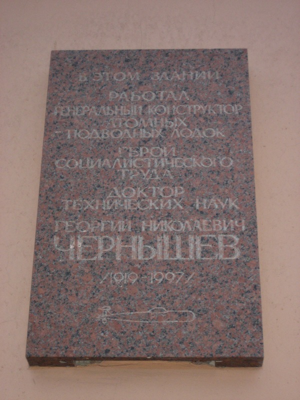 Мемориальная доска в память о Г.Н. Чернышёве на здании ОАО СПМБМ "Малахит" в Санкт-Петербурге (улица Фрунзе, д.18). Фото Алексея Пиголицына. 2012 г.