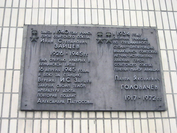 Установлена в городе Гомель (улица Севастопольская, дом 153) на здании ПТУ №56 имени П.Я.Головачёва. Фото Владимира Примаченко.