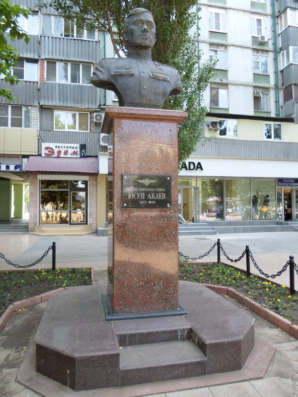 Бюст Ю. А. Акаева, установленный в городе Махачкала на пересечении проспекта Расула Гамзатова и улицы Леваневского. Фото С. Кузоватова (2016).