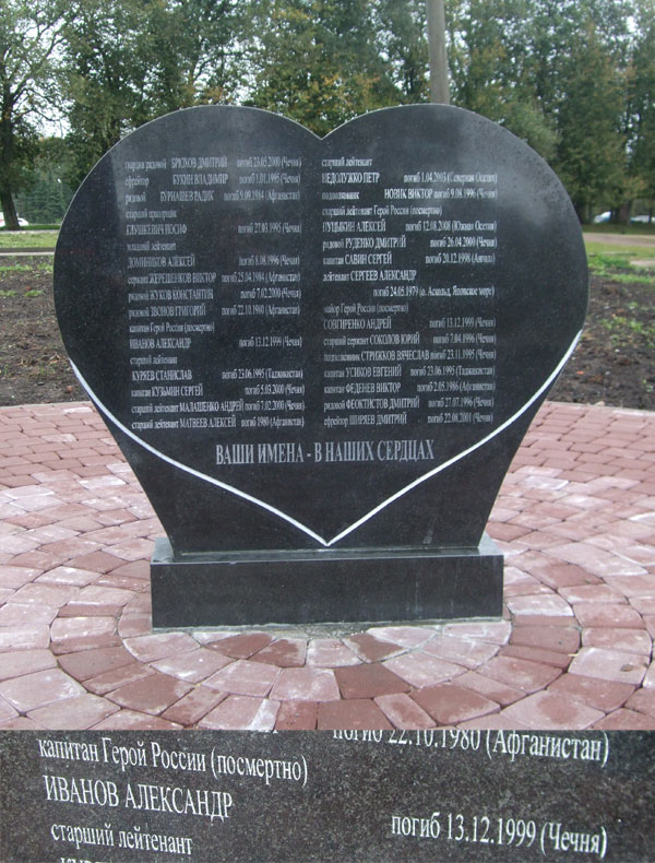 В городе Вязьма Смоленская область в центре города на площади Советская находится установлен памятник с именами погибших военнослужащих в локальных войнах. Среди них имена Героев РФ (посмертно): капитана Иванова Александра, старшего лейтенанта Пуцыкина Алексея, майора Совгиренко Андрея. Фото Александра Захарова, сделано 15 сентября 2012 года.