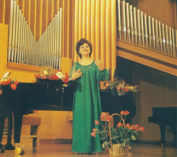 М.Л.Биешу выступает на камерном концерте. 1983 г. Фото из альбома «Мария Биешу» (Кишинёв, издательство «Тимпул», 1986 г.).