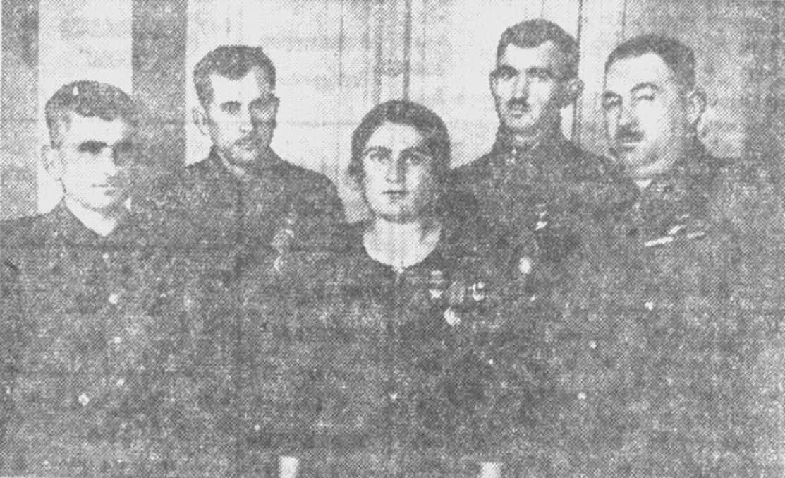 Герои Социалистического Труда (слева направо) Георгий Натрошвили, Иван Барнабишвили, Этери Камаридзе, Вахтанг Гоголадзе и Эраст Самаргвелиани – представители от Лагодехского района на республиканском совещании передовиков сельского хозяйства Грузинской ССР в апреле 1949 года.