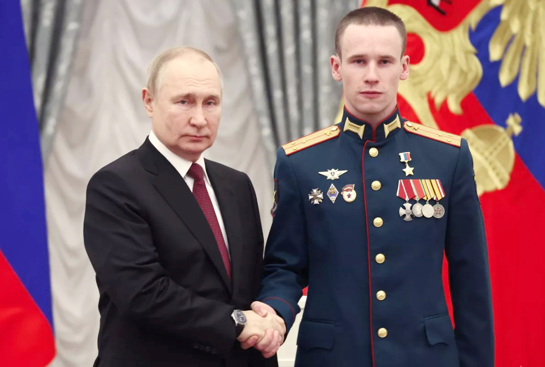 Герой Российской Федерации гвардии старший старший лейтенант С. М. Белов во время вручения президентом России В. В. Путиным медали «Золотая Звезда». Москва, Кремль, Екатерининский зал Сенатского дворца, 20 декабря 2022 года. Фото: РИА Новости.