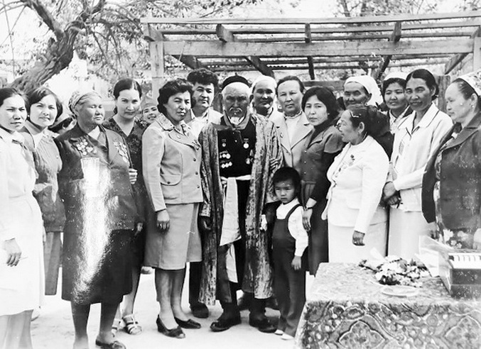 Ибрай Жахаев (в центре) в день своего восьмидесятилетия во дворе средней школы №149. 3-я слева – Закира Ержанова. Аул Кызыл-Ту Шиелийского района,16 мая 1971 года. Фото предоставил Бахытбек Досмаилов.