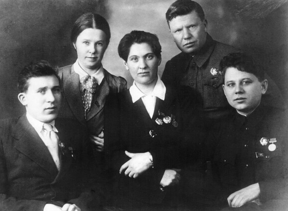Передовики сельского хозяйства (слева направо) комбайнер А. И. Оськин, бригадиры тракторной бригады П. И. Ковардак, П. Н. Ангелина, комбайнеры Ф. Колесов, К. А. Борин. Москва, 1939 год.