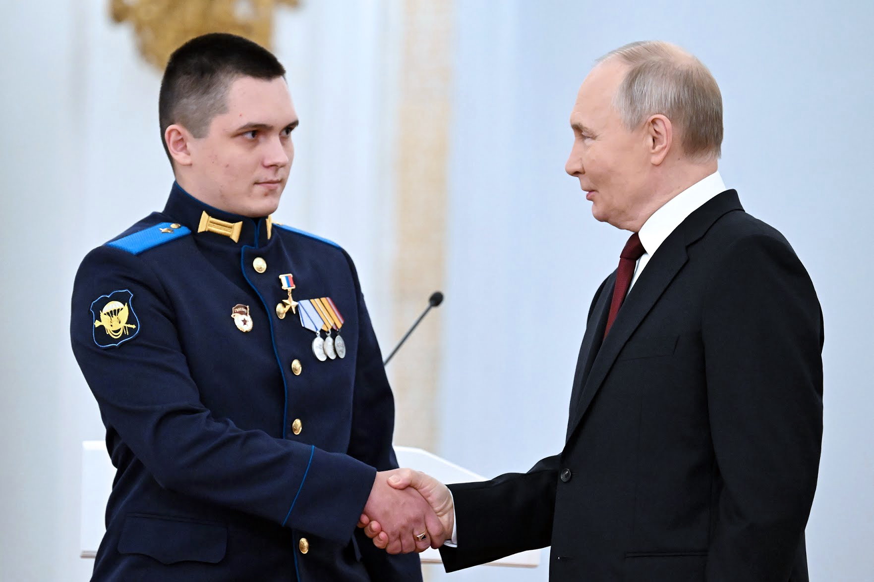 Герой Российской Федерации гвардии рядовой А. М. Асылханов (слева) на церемонии вручения медали «Золотая Звезда» в Георгиевском зале. Москва, Кремль, 9 декабря 2024 года. Фото: Алексей Майшев/РИА Новости («Российская газета»).