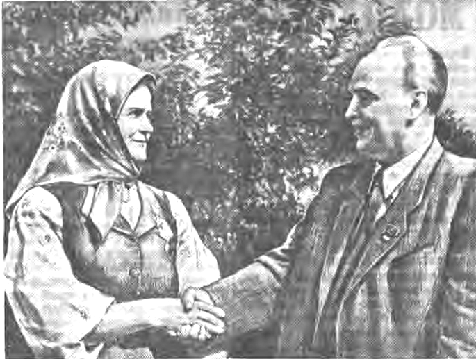 Председатель Львовского облисполкома Кузьма Николаевич Пелеватый вручает награды Героя Социалистического Труда Ульяне Даниловне Баштык, начало сентября 1949 года.